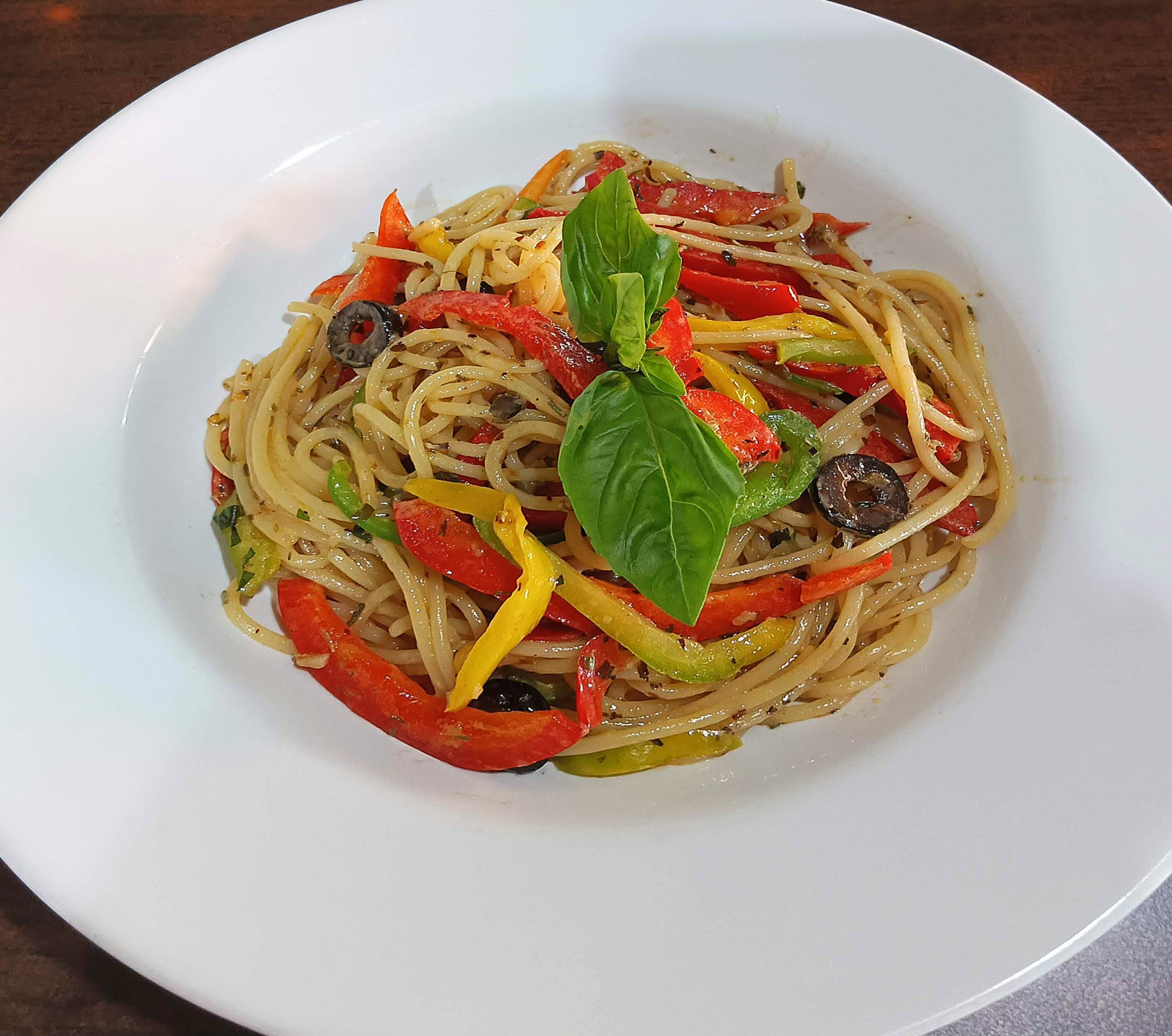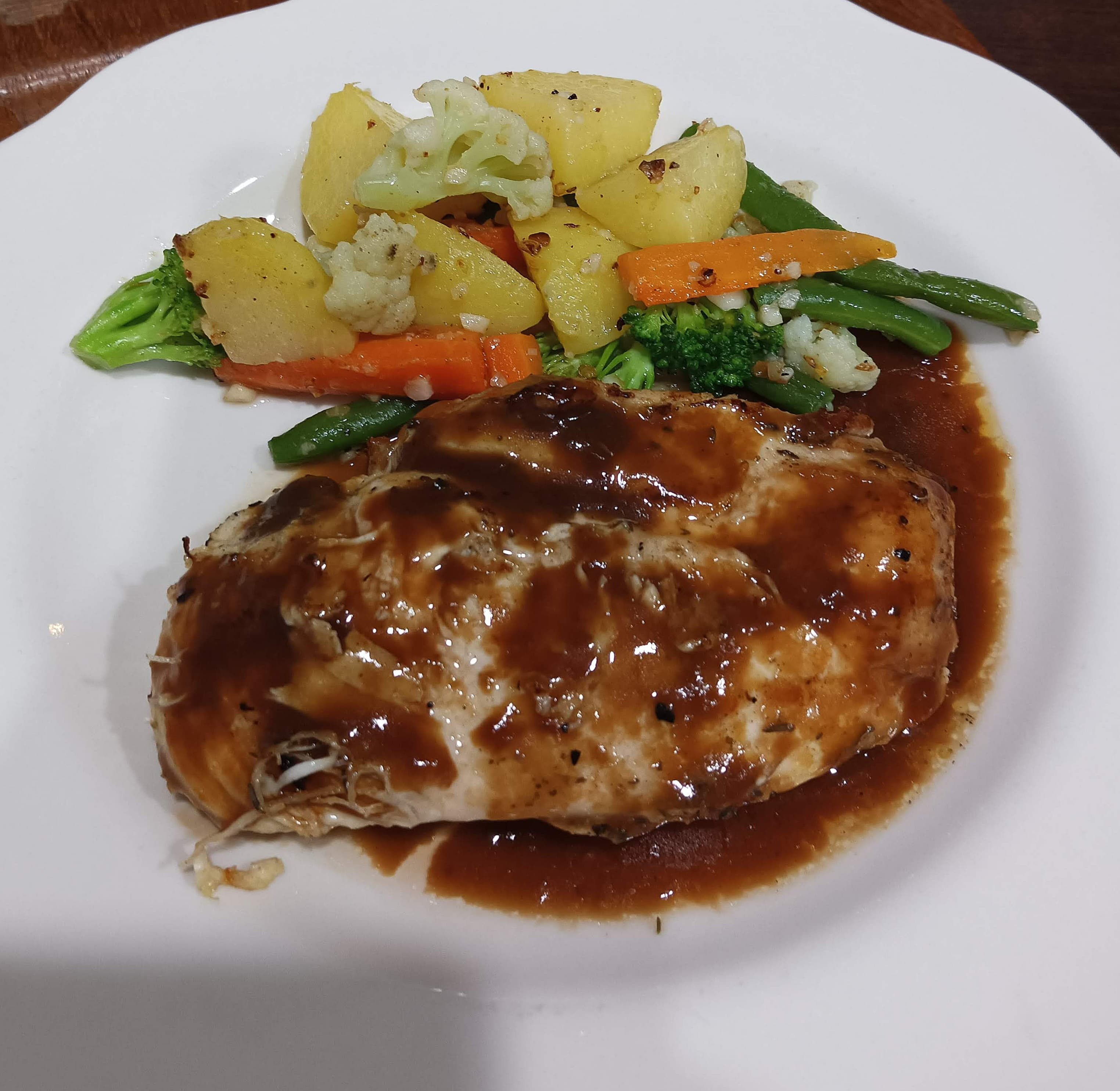 Australian chicken parmesan roasted melted mozarella served with lyonnaise potato and stir fry vegetable
