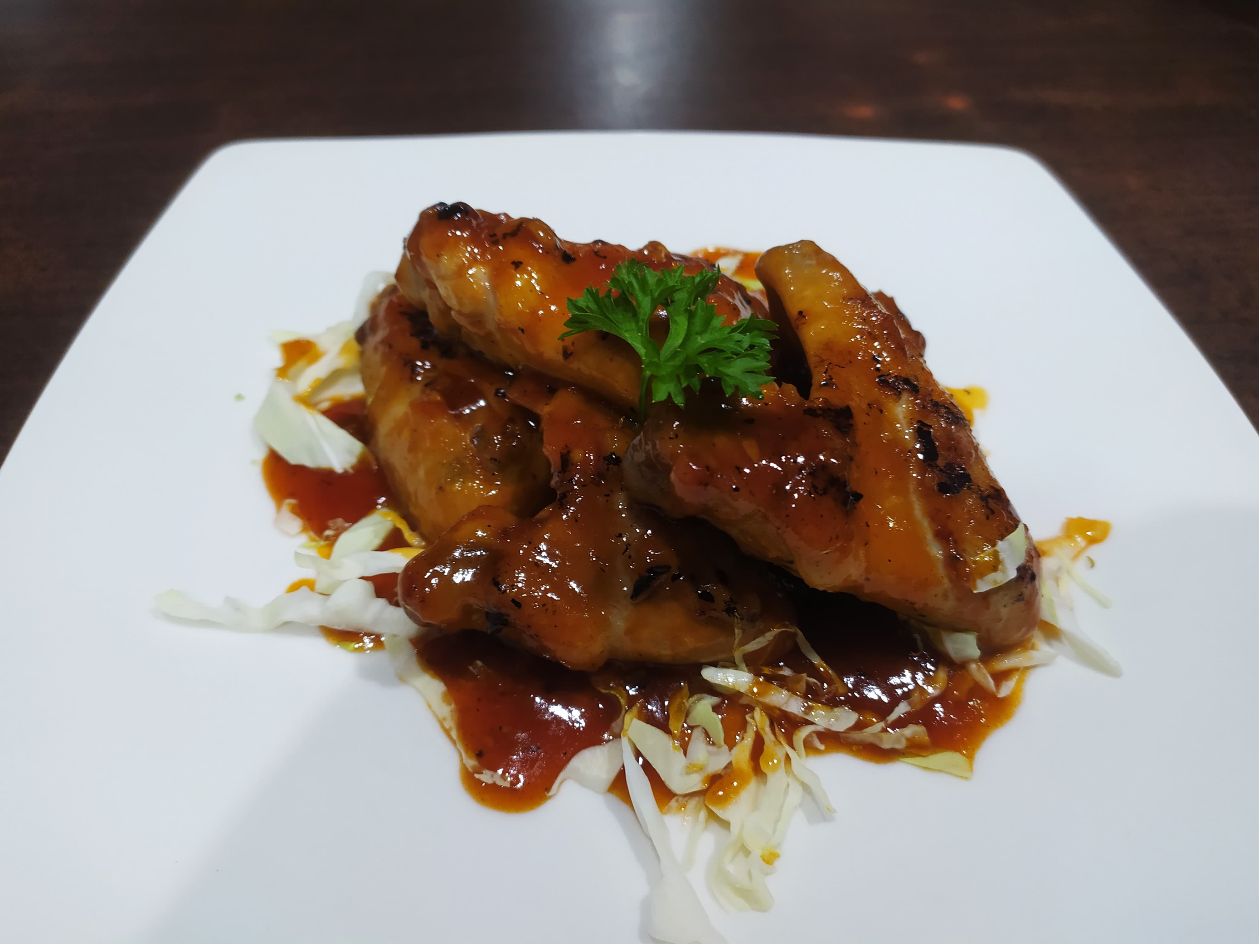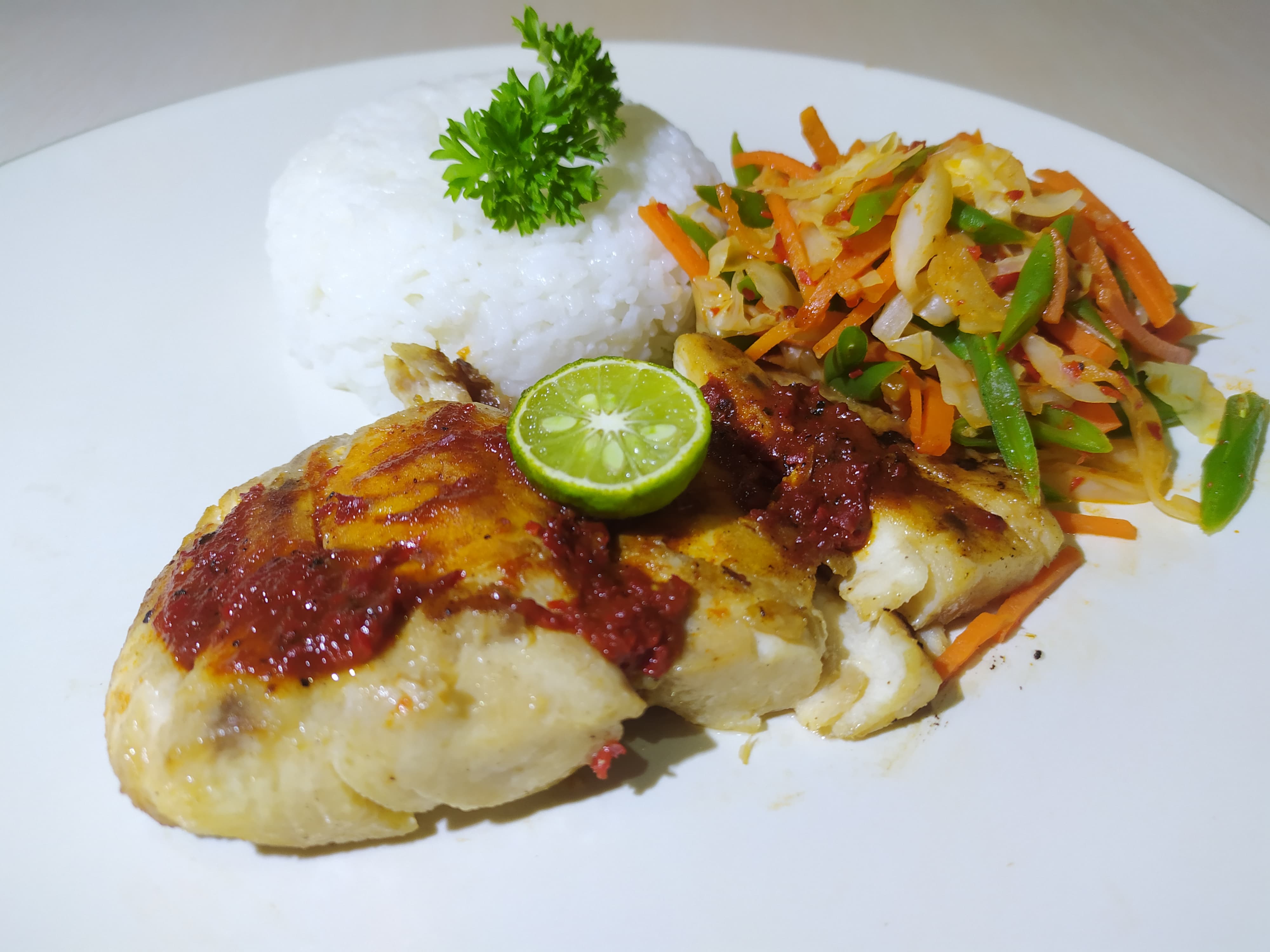Grilled Chicken tossed on authentic red Balinese sauce, kaffir lime served with plecing and steam rice