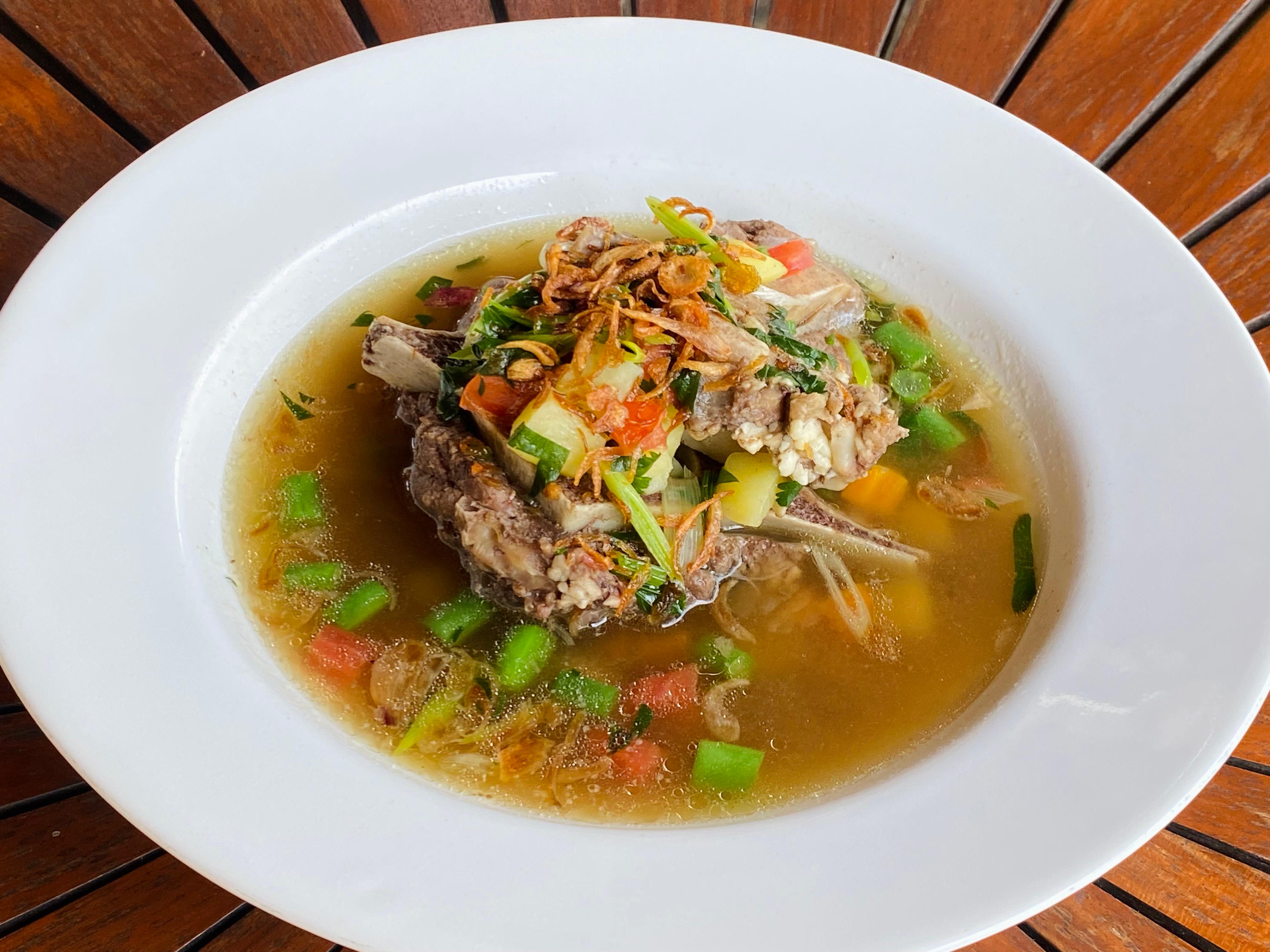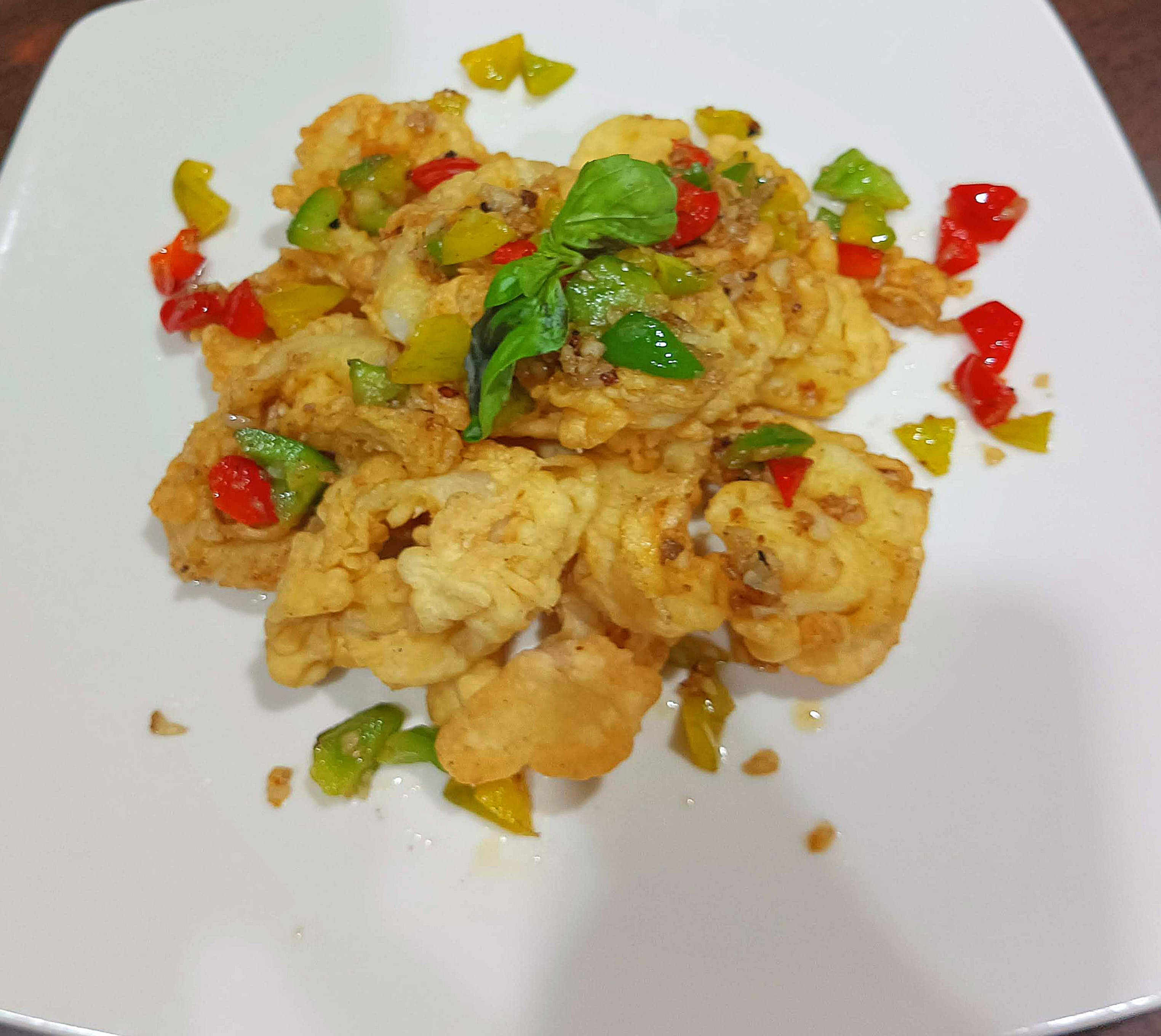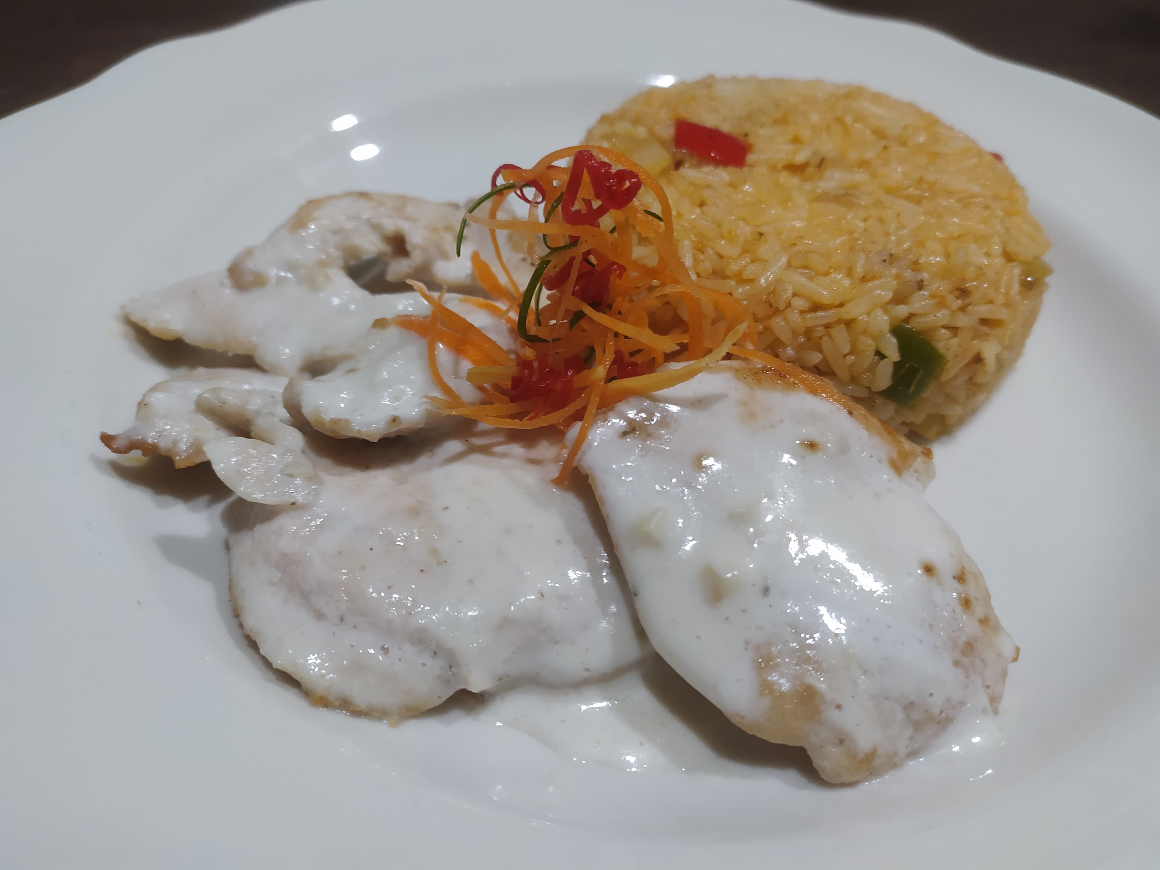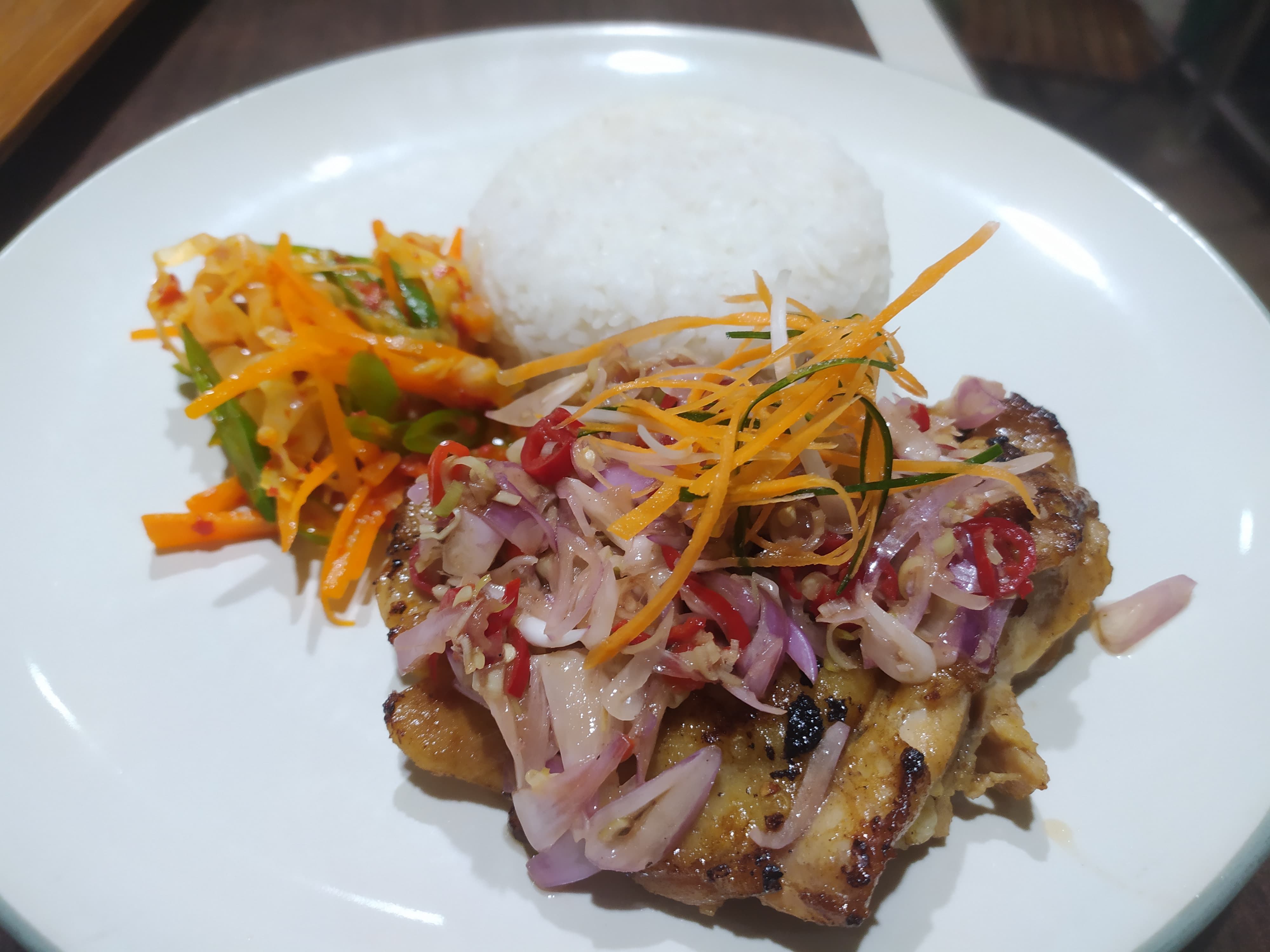 Grilled chicken tossed with fine slices of shallot, lemon grass, chili, & coconut oil, served with plecing and steam rice