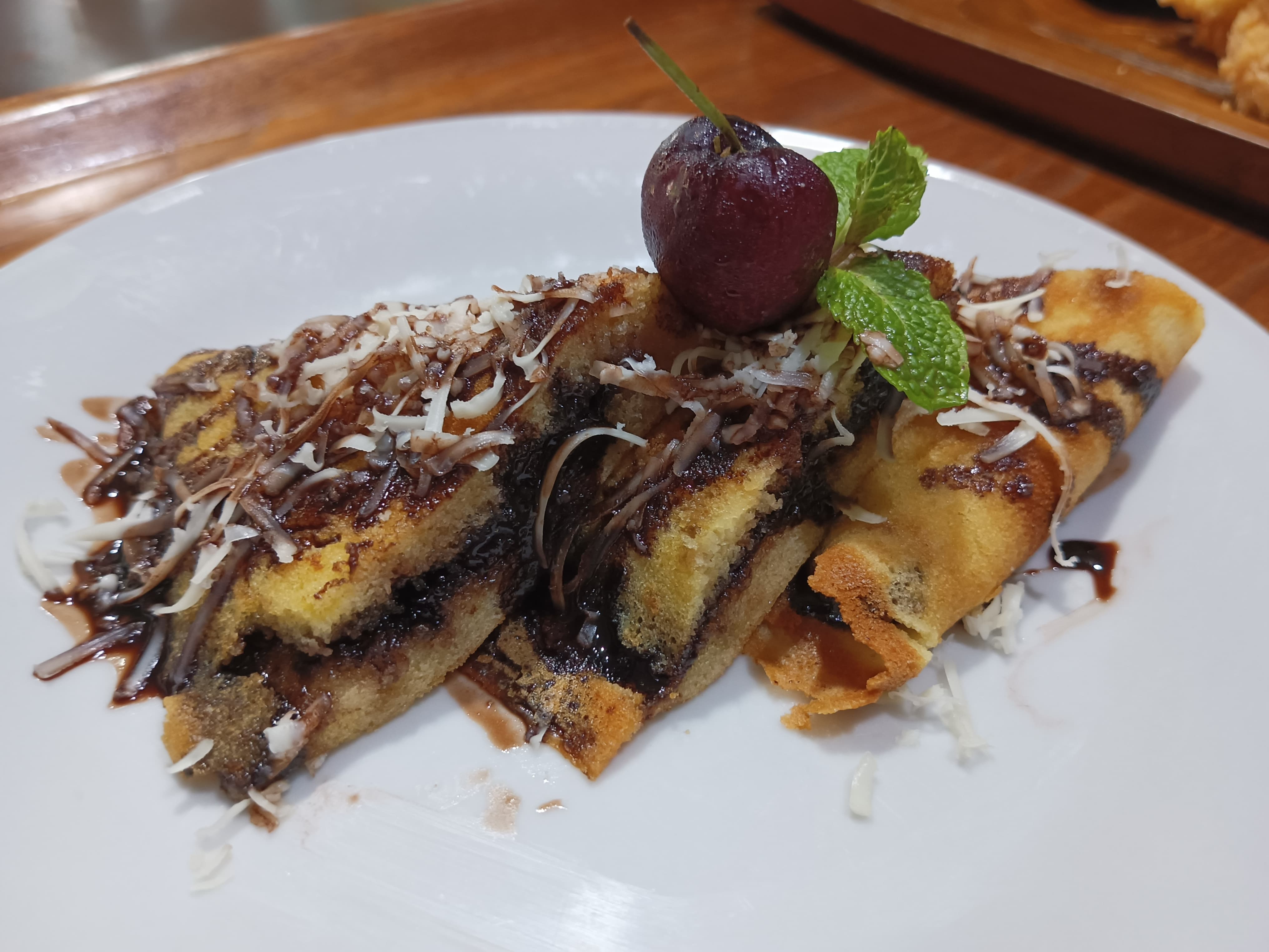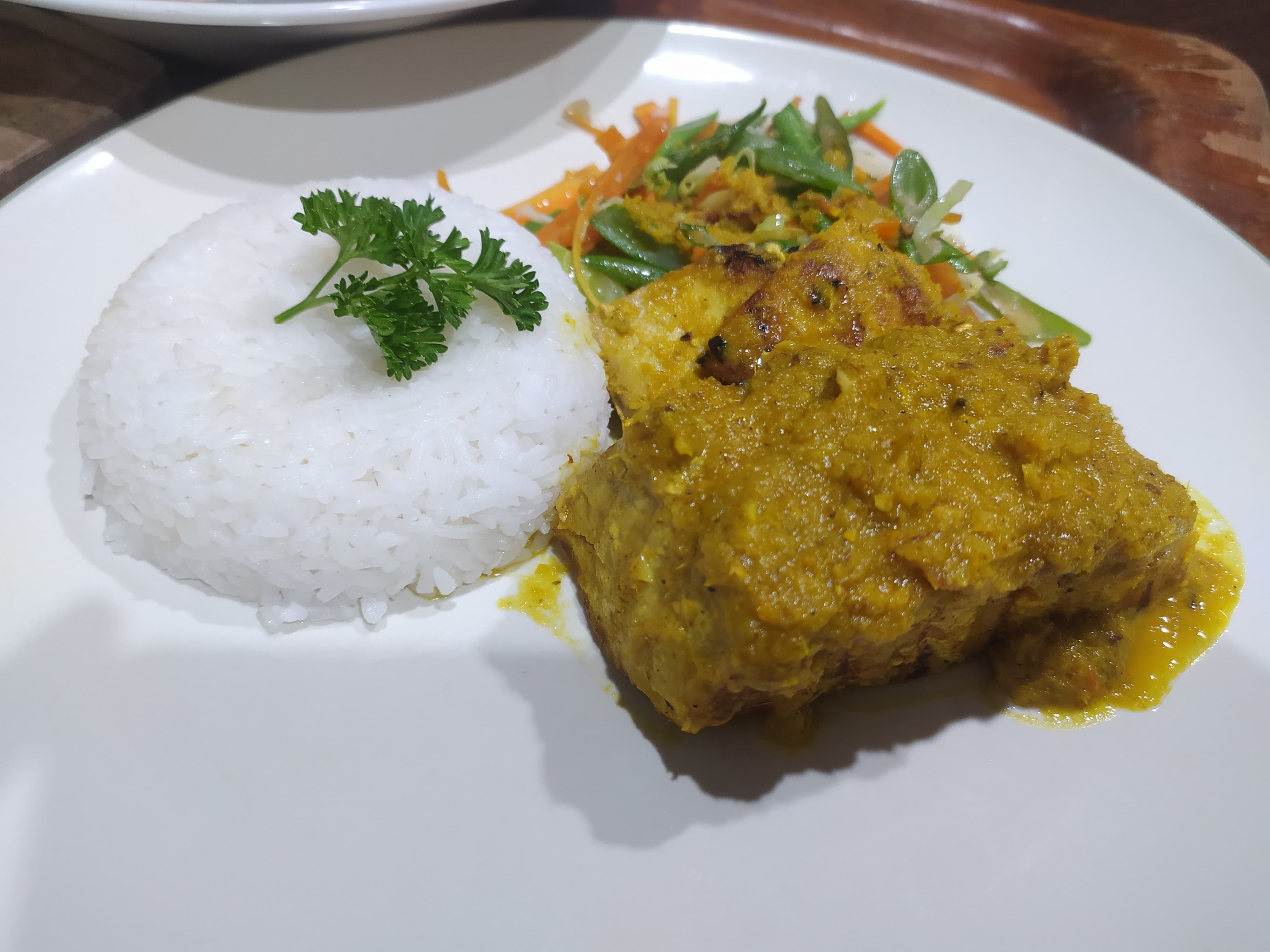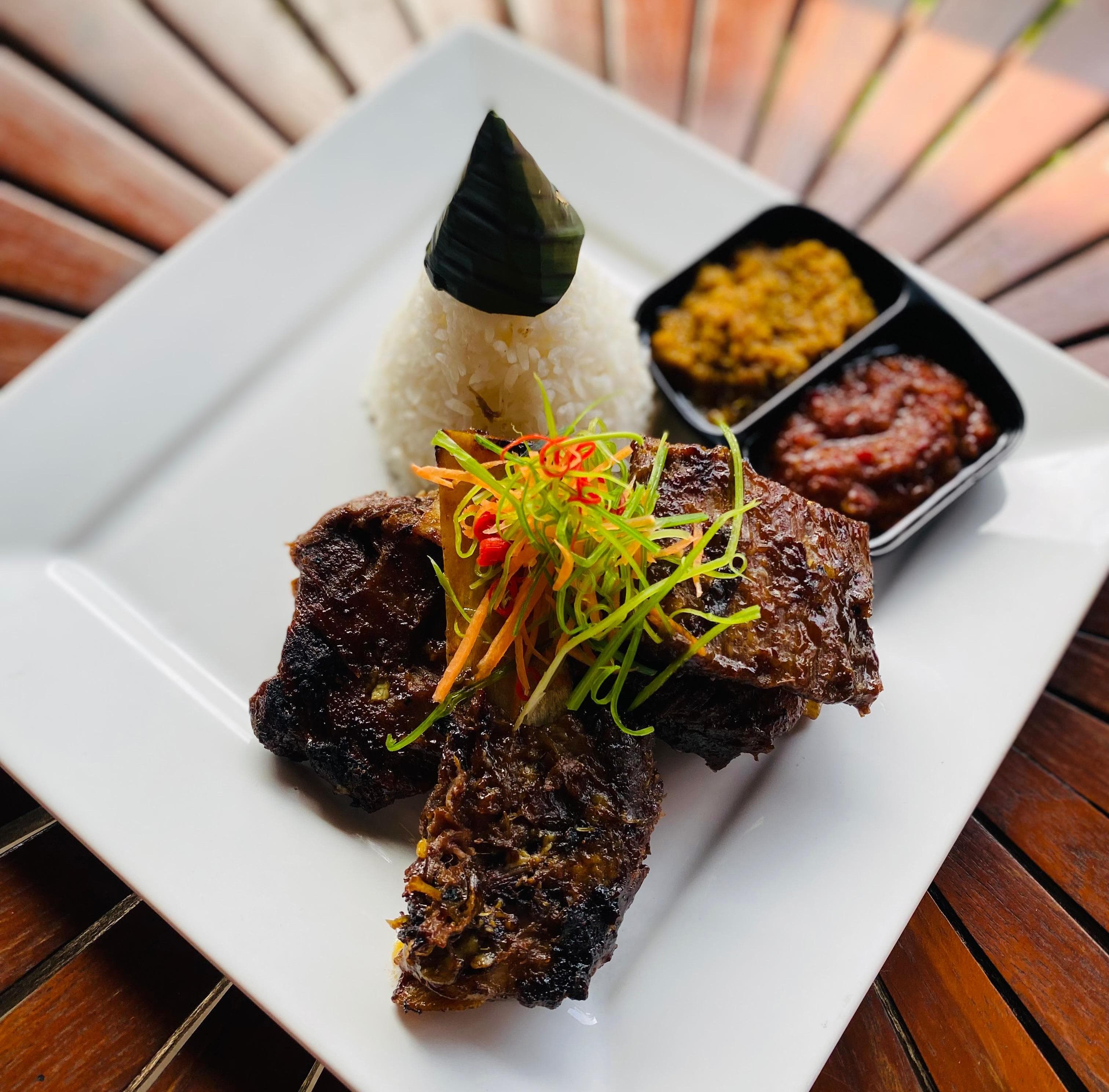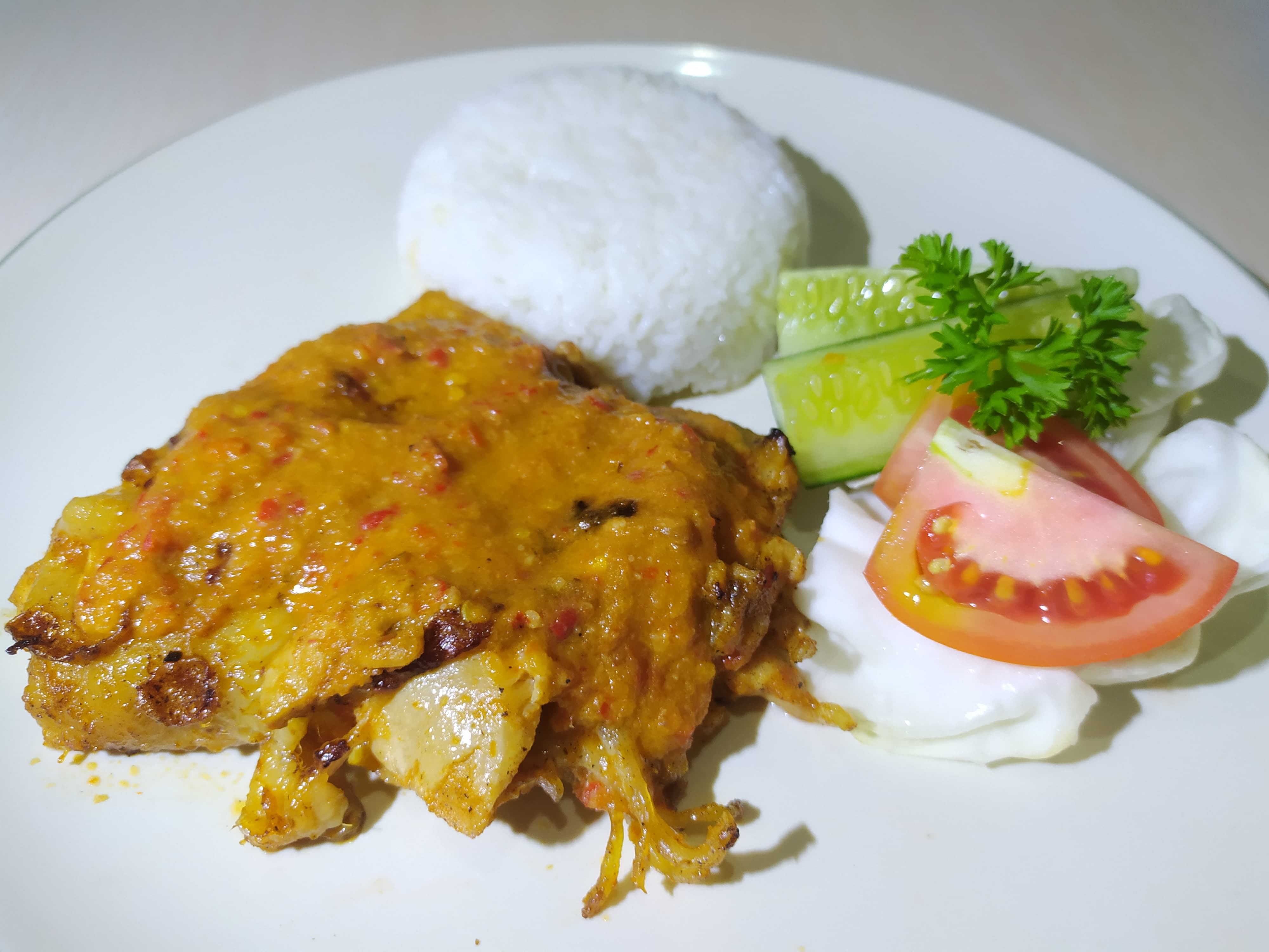 Grilled Fish tossed with fine slices of shallot, lemon grass, chili, & coconut oil, served with plecing and steam rice
