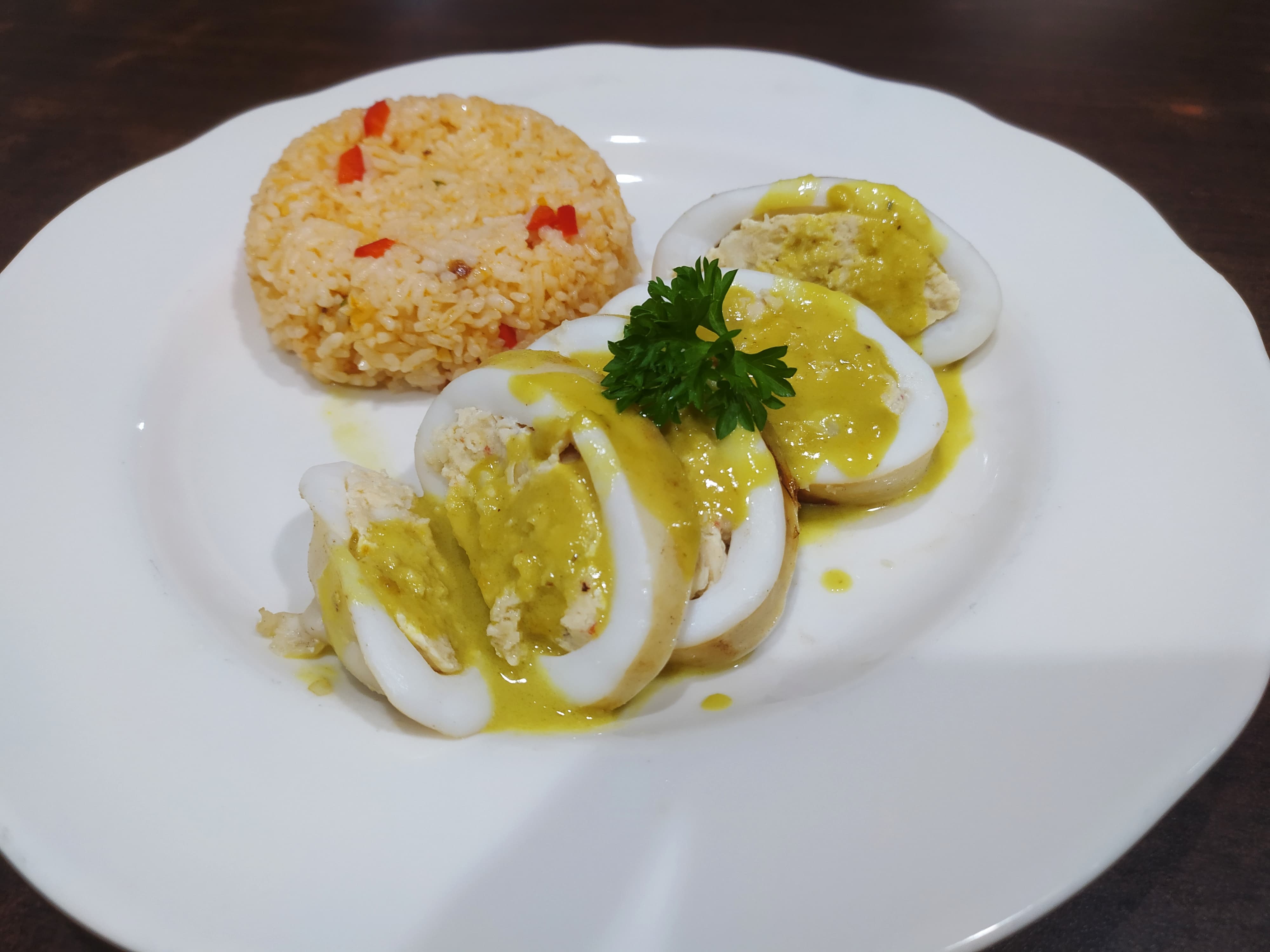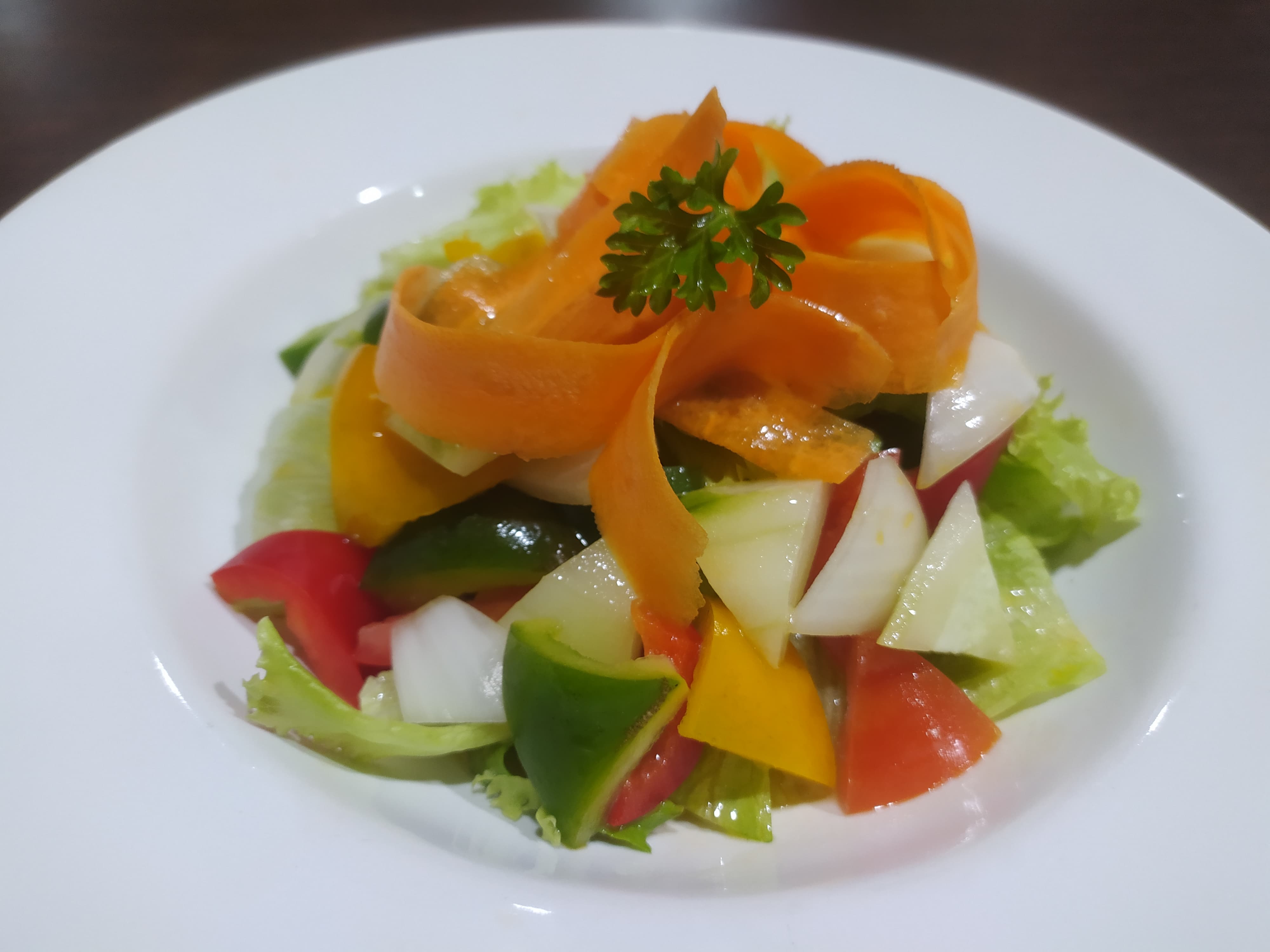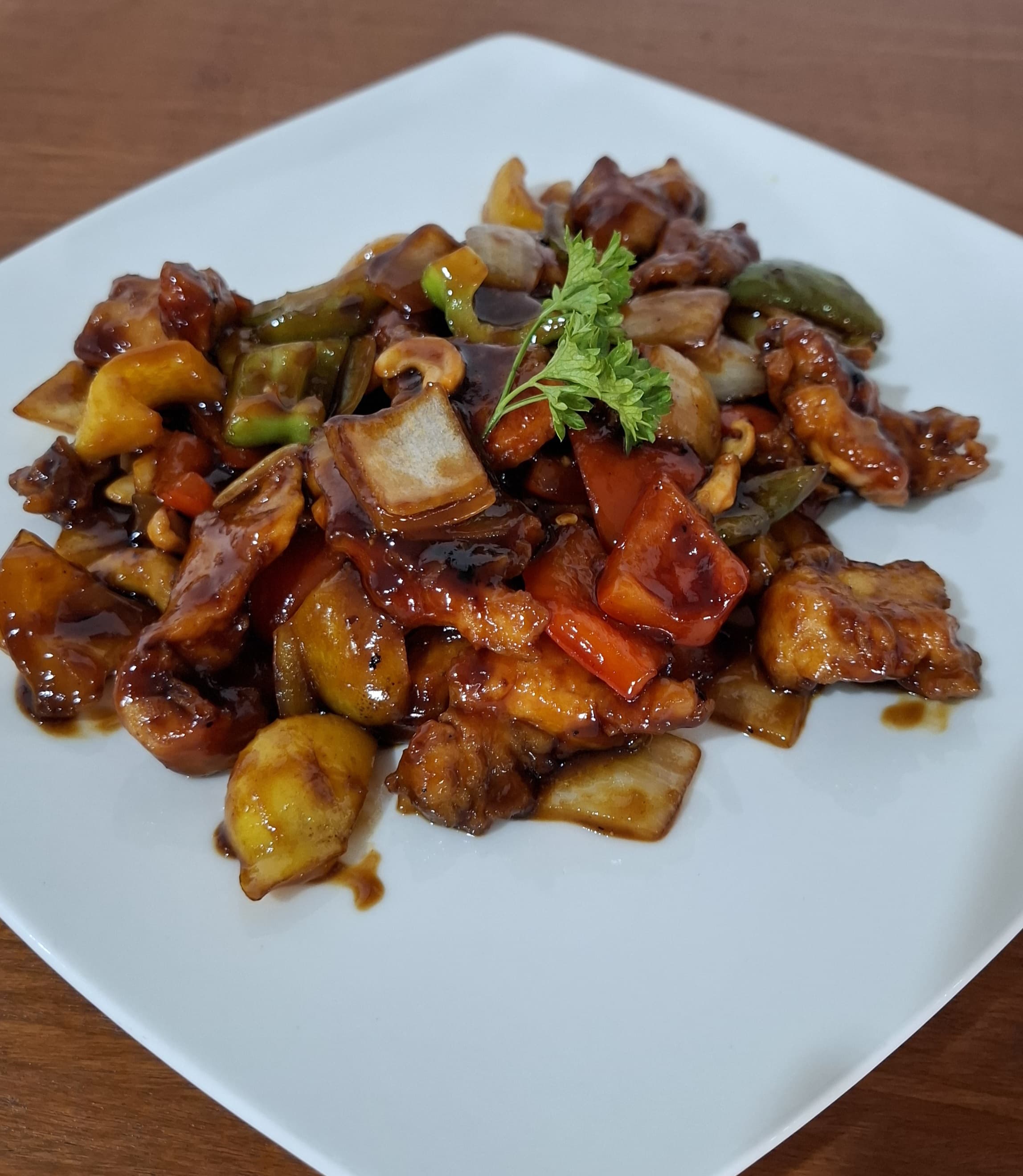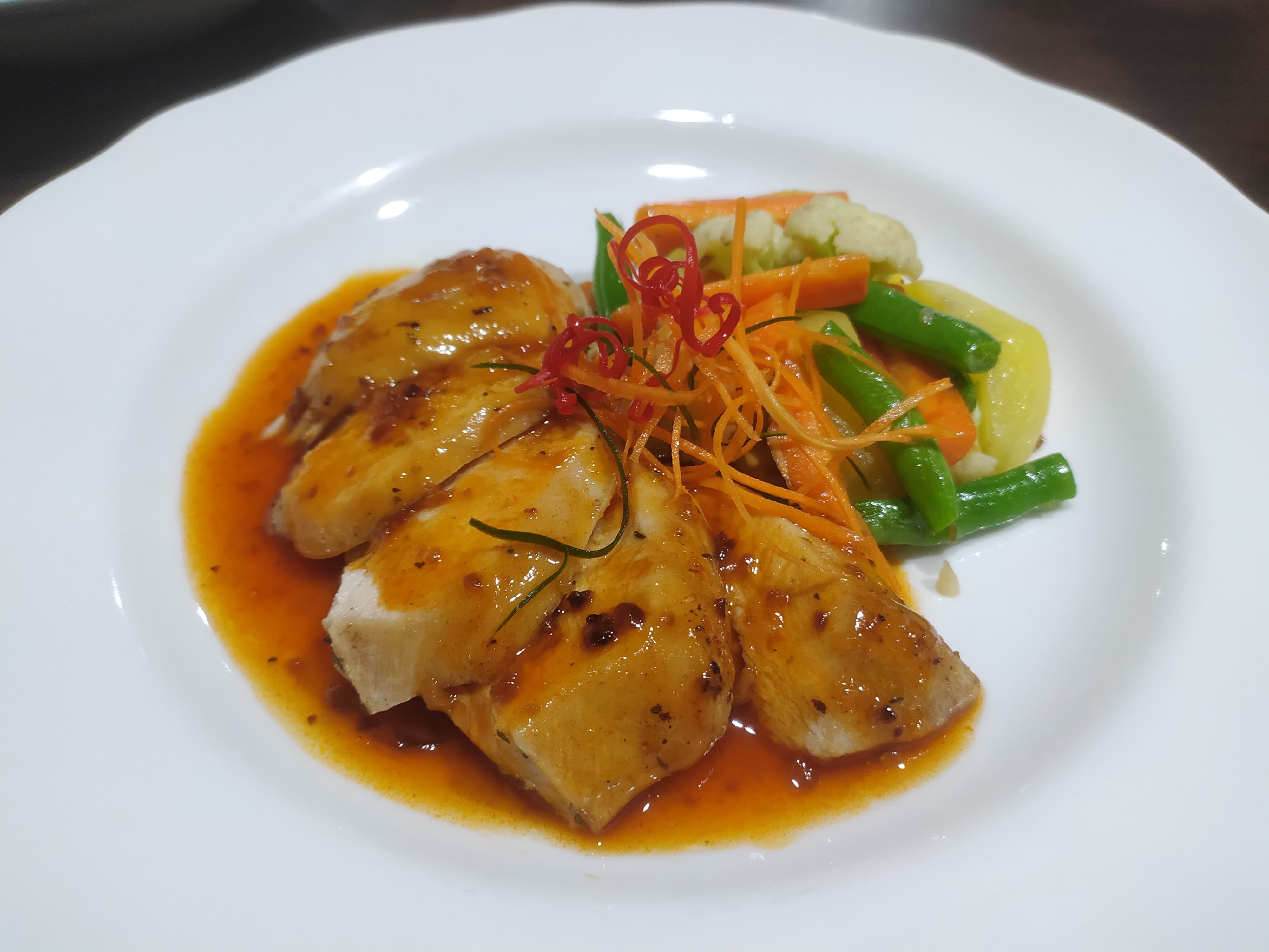 Braised Chicken Breast tossed an authentic Lombok sauce with Steam Rice and fresh cucumbar, cabbage, tomato