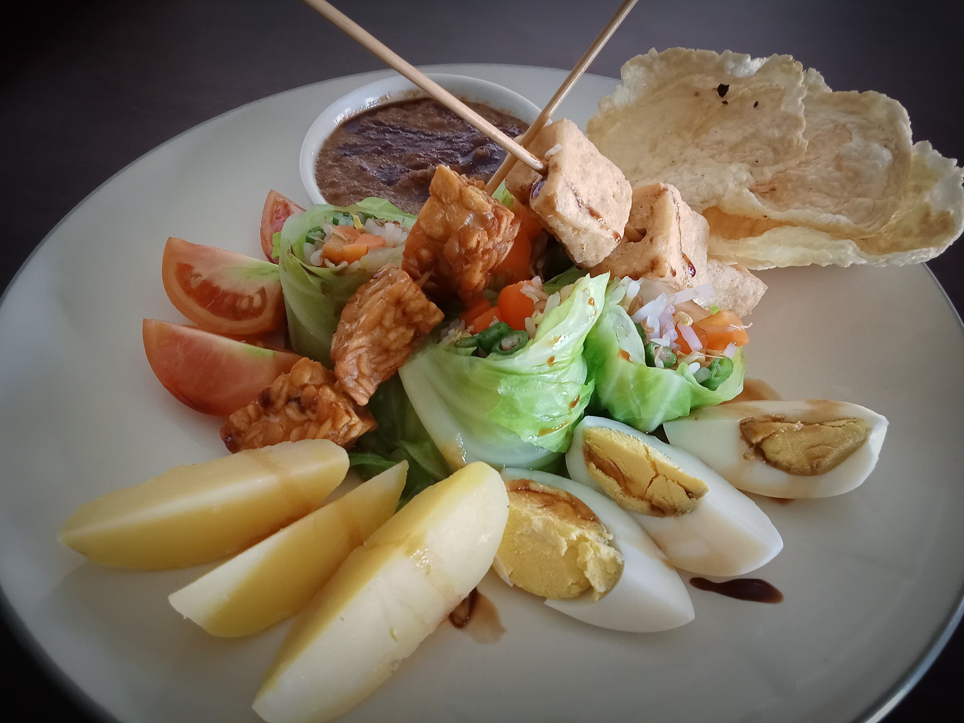 Smoked or roasted chicken marinated spicy Balinese sauce served with cassava leave and steam rice