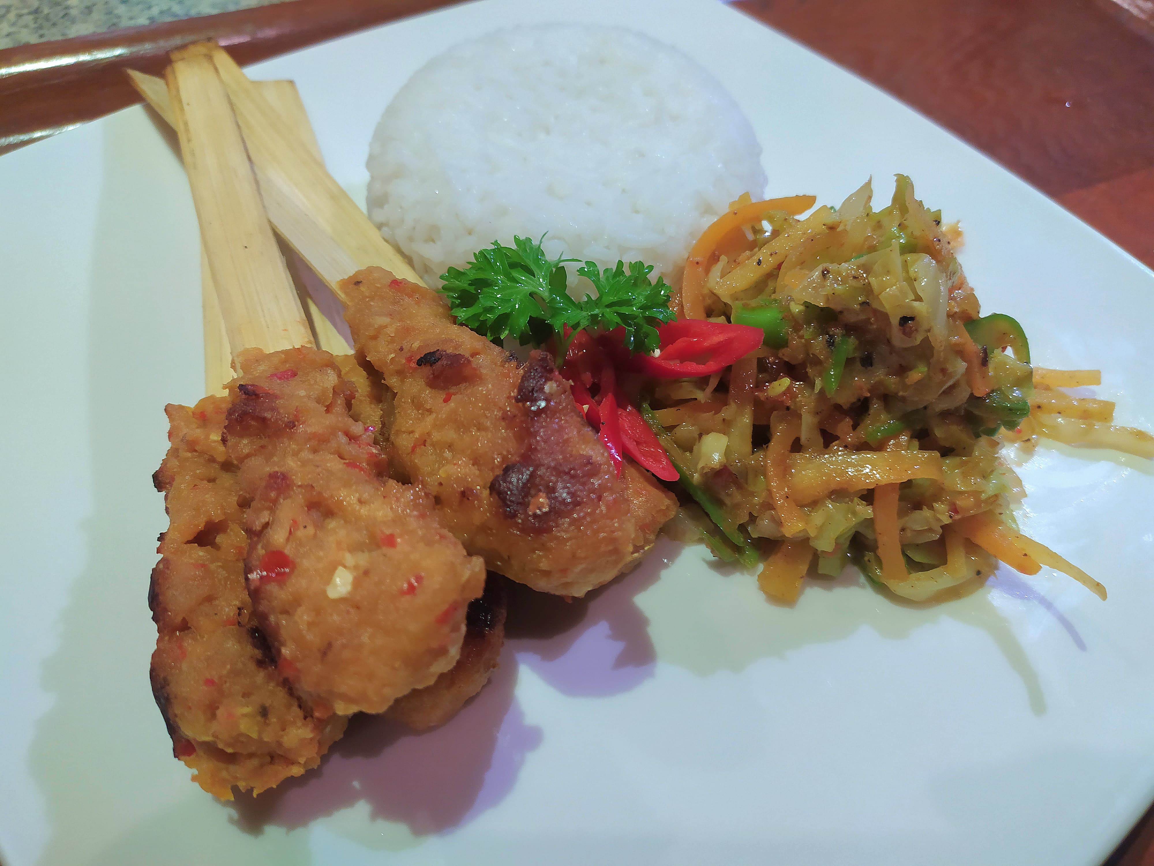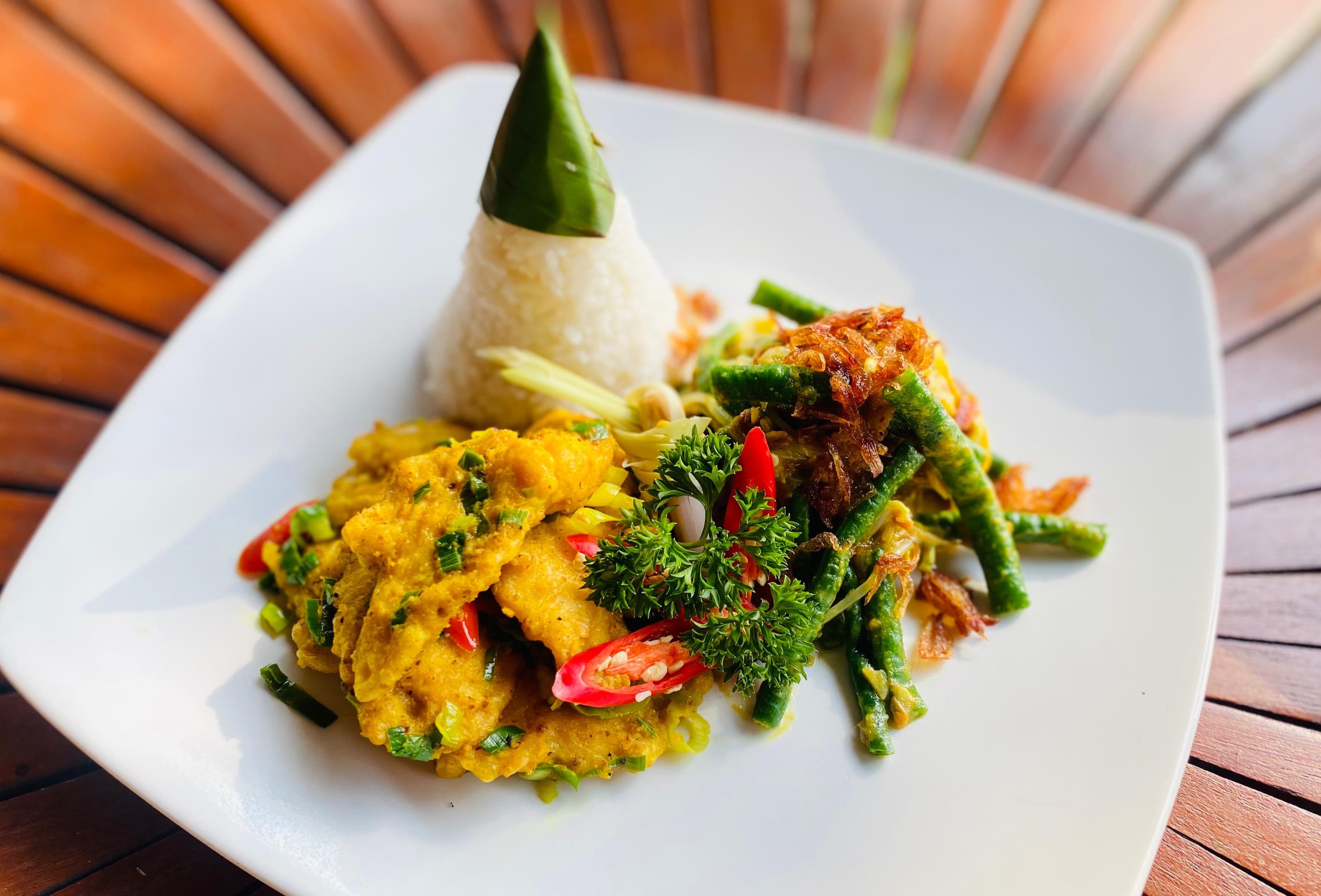Grilled Fish tossed on authentic red Balinese sauce, kaffir lime served with plecing and steam rice